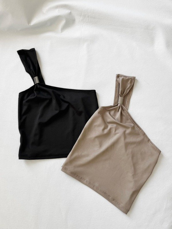 • Top de microfibra, escote asimetrico con detalle de gancho