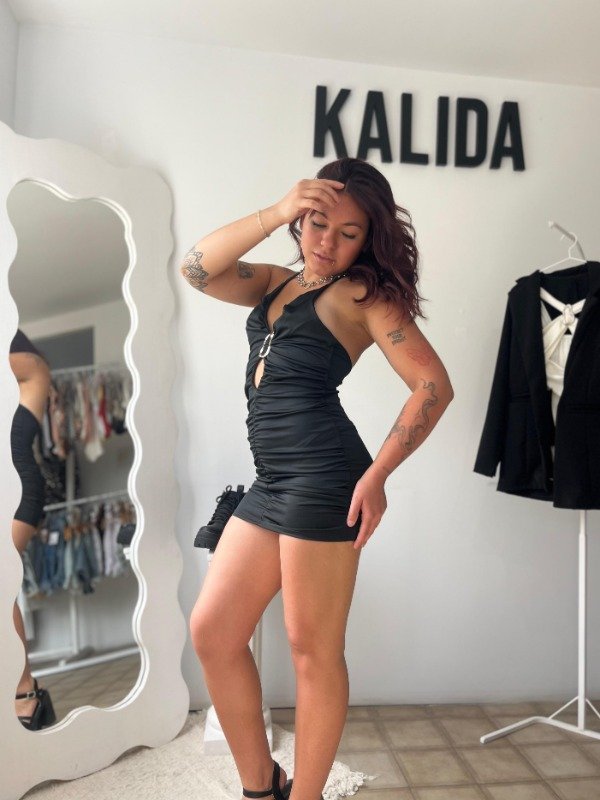 • Vestido de microfibra con frunce frontal y escote halter