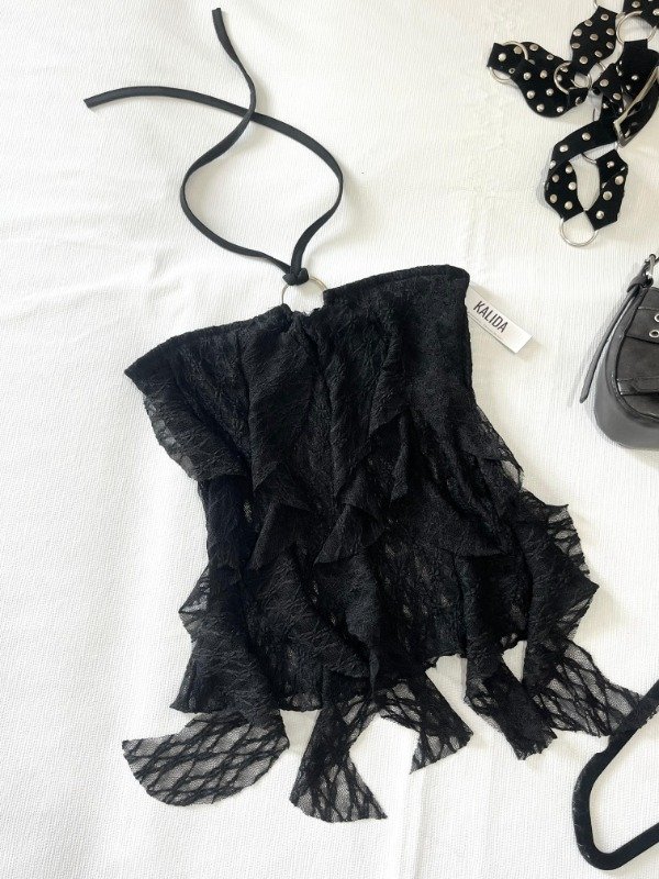 • Top straples de encaje con tira al cuello y volados